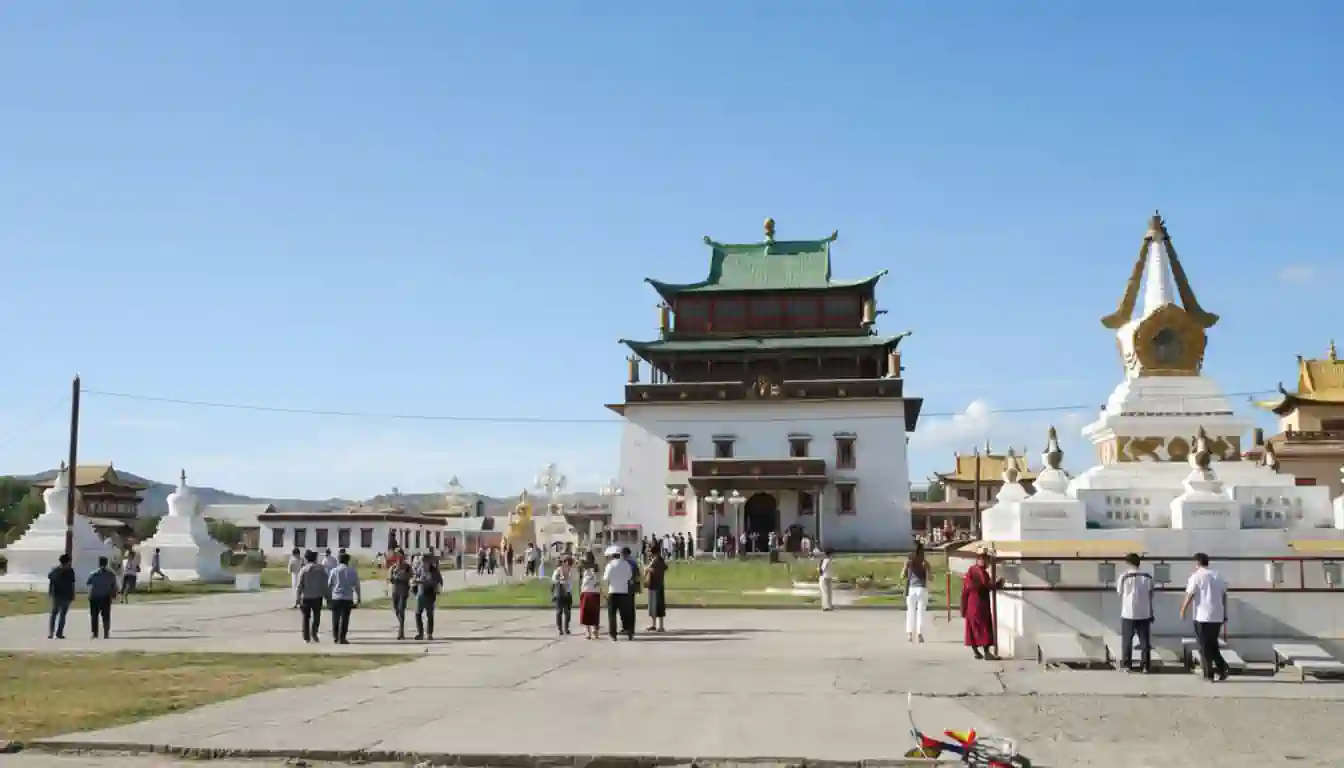 蒙古烏蘭巴托甘丹寺,白色宏偉的章冉澤大佛殿建築,前方有白色的佛塔與穿梭於廣場的信眾。